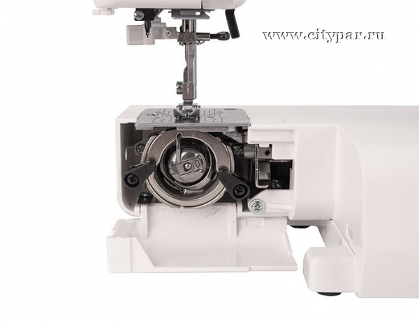 Модель оснащена вертикальным челноком, нитевдевателем, рукавной платформой и функцией реверса.